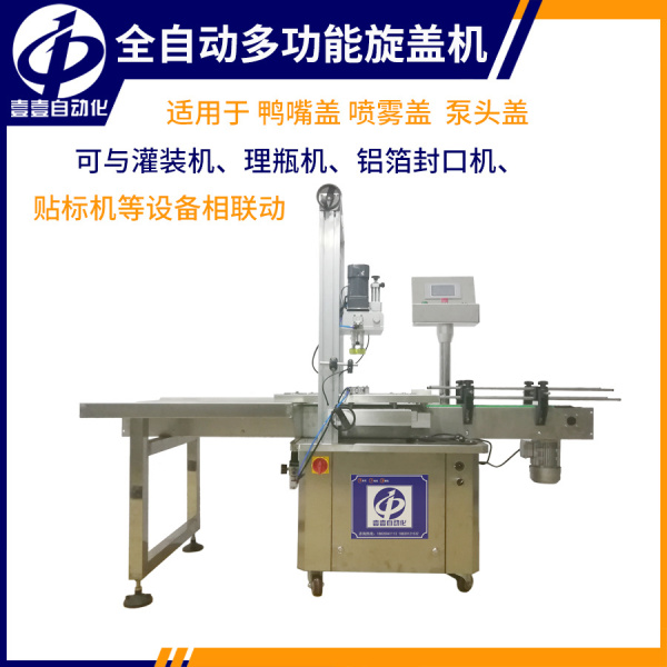 全自動旋蓋機是我公司全新研制的機型,具有自動送瓶定位、自動壓蓋、自動鎖蓋等功能。可與灌裝機、理瓶機、鋁箔封口機、貼標機等設備相聯動,組成全自動灌裝生產線。廣泛應用于日用品、化妝品、制藥、食品、化工等行業。